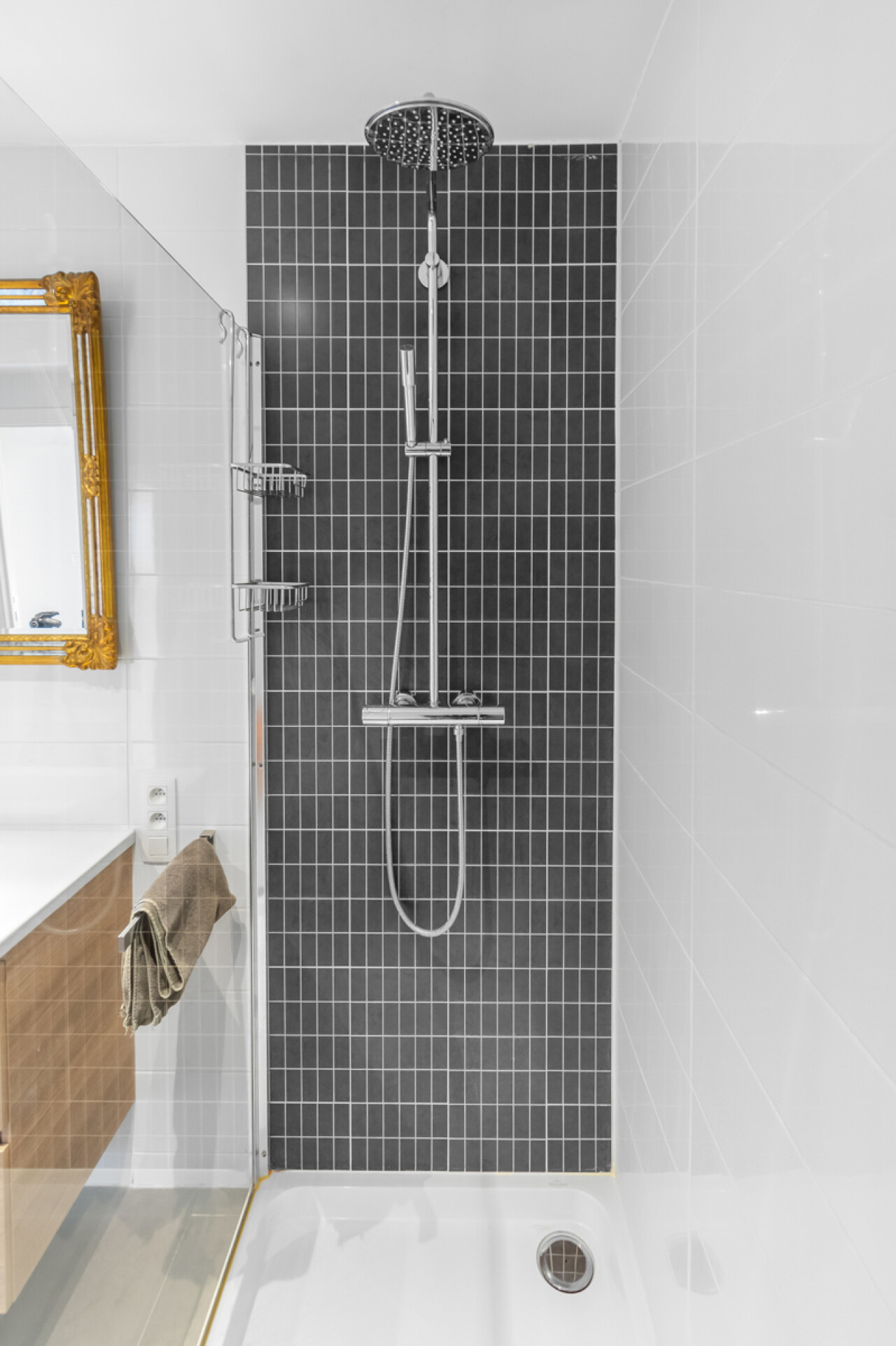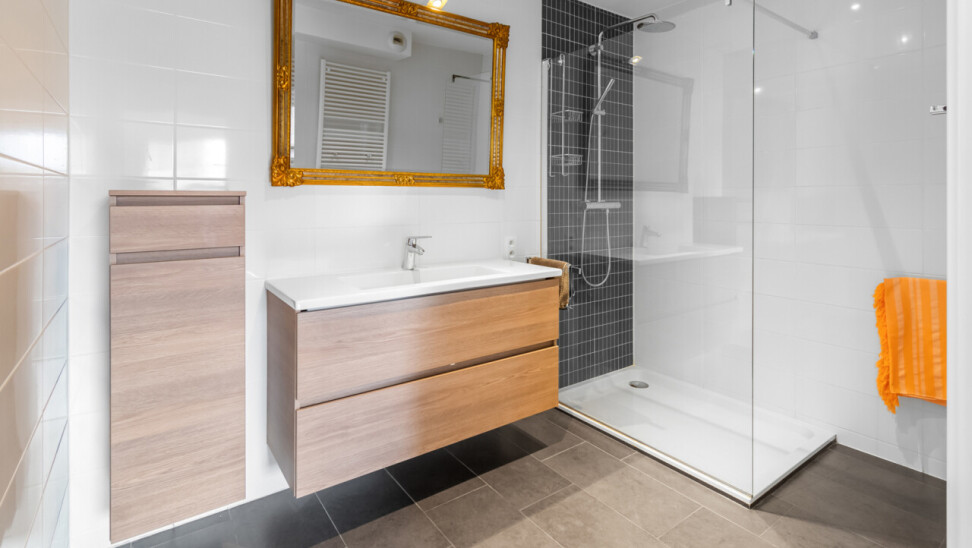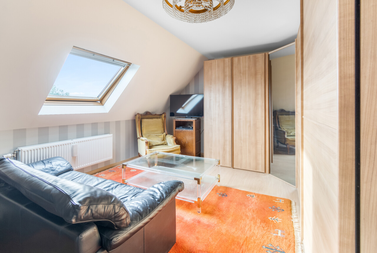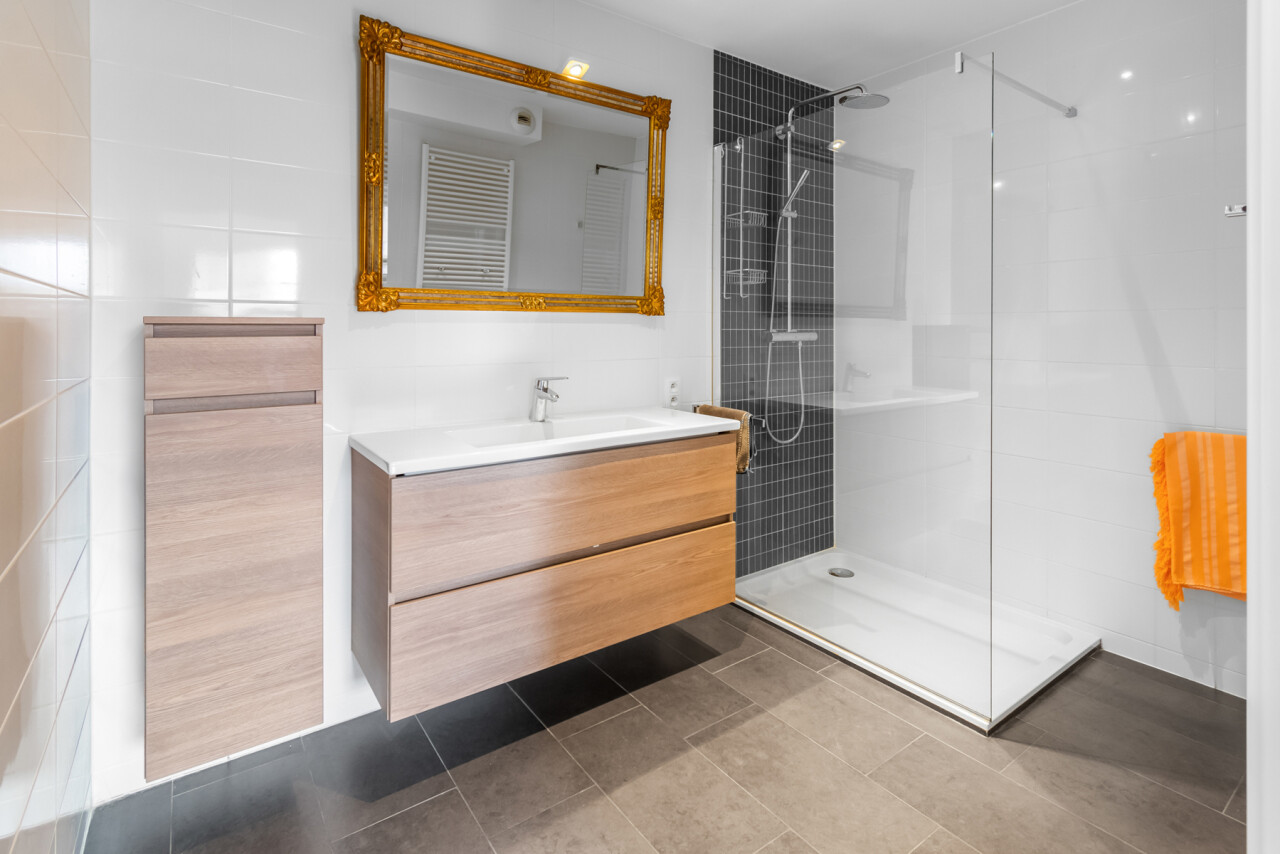 Ce niveau comprend également un espace de rangement pratique, une salle de bains avec double lavabo et douche, un WC séparé, ainsi qu’une des chambres.