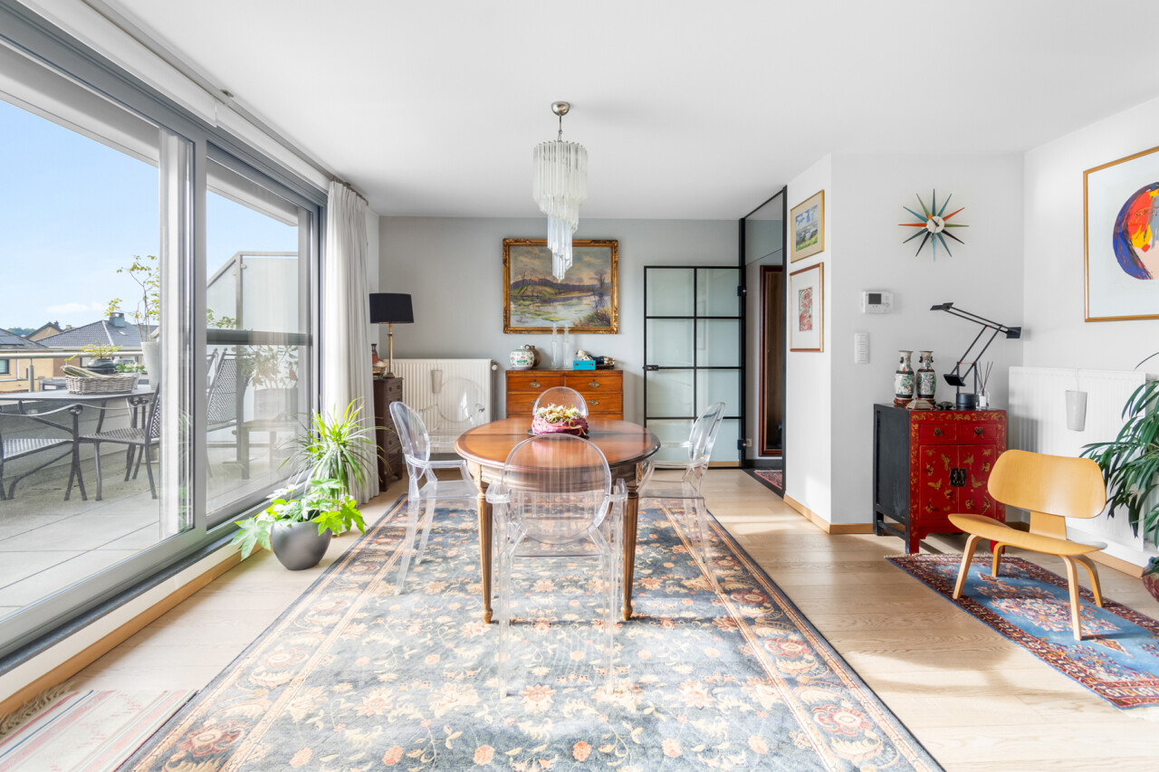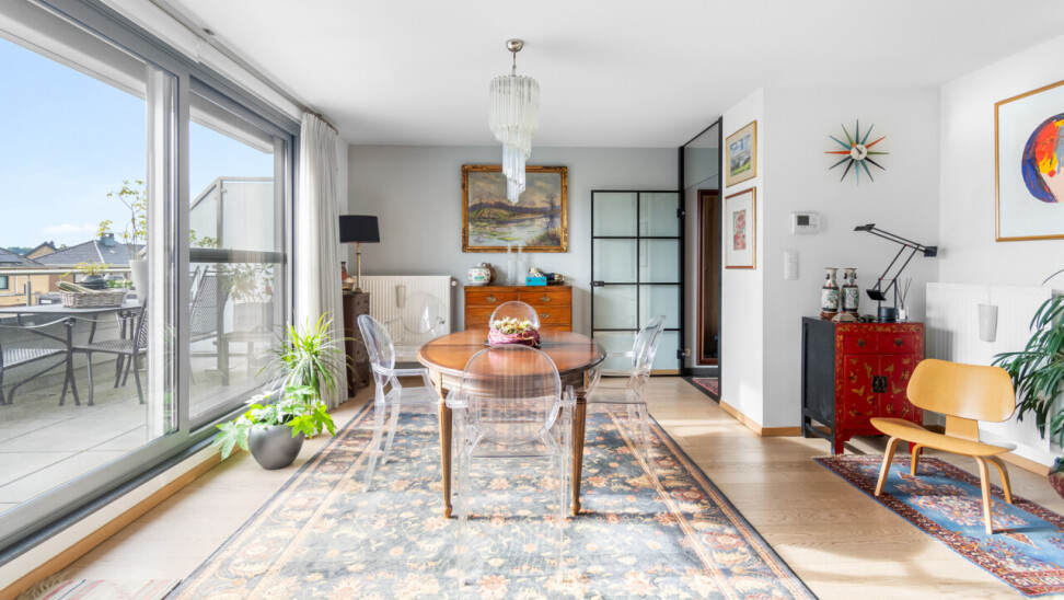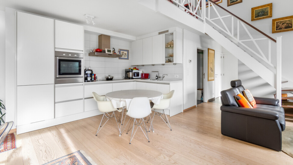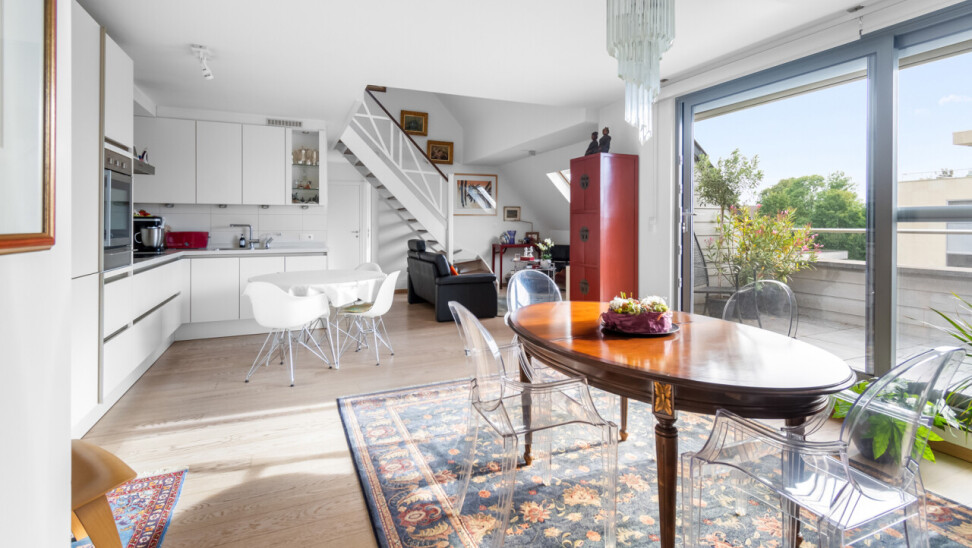 En entrant dans l’appartement, situé au dernier étage, vous êtes accueilli par un hall d’entrée avec placard intégré. Le vaste et lumineux séjour avec cuisine ouverte constitue le véritable cœur du logement. La cuisine, entièrement équipée d’appareils modernes, allie fonctionnalité et finitions élégantes.