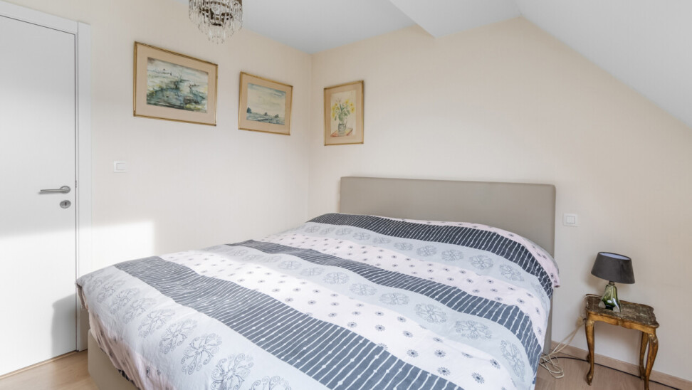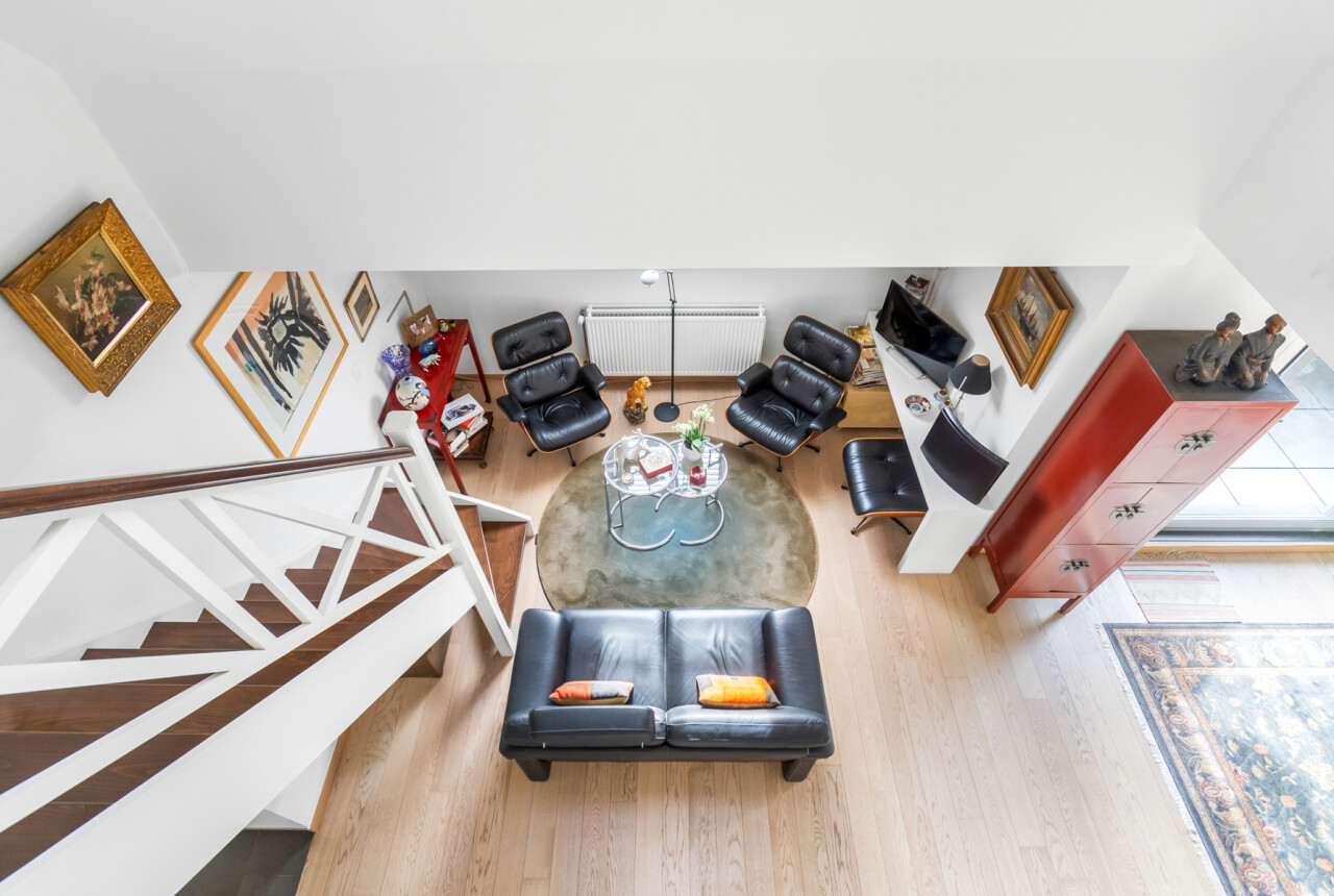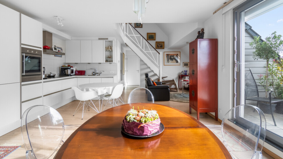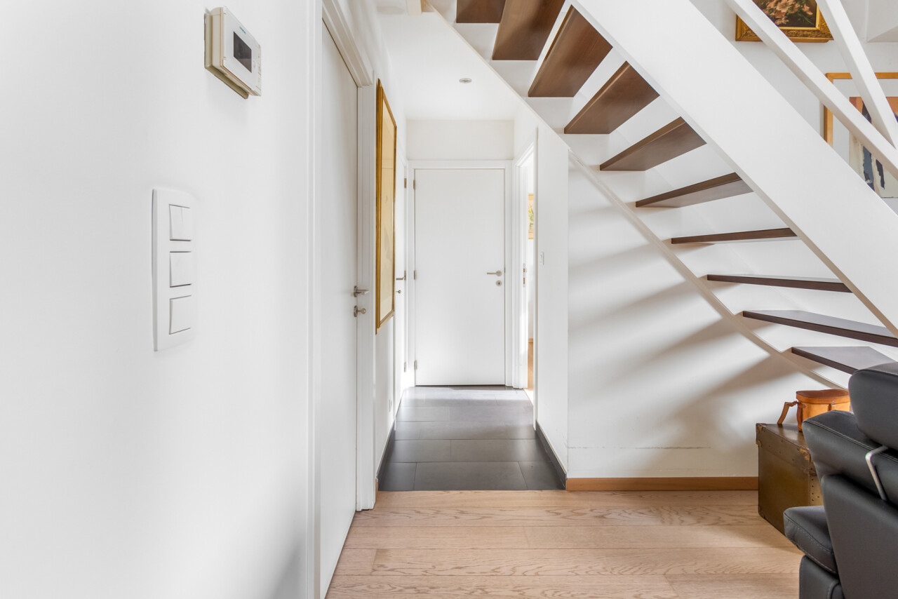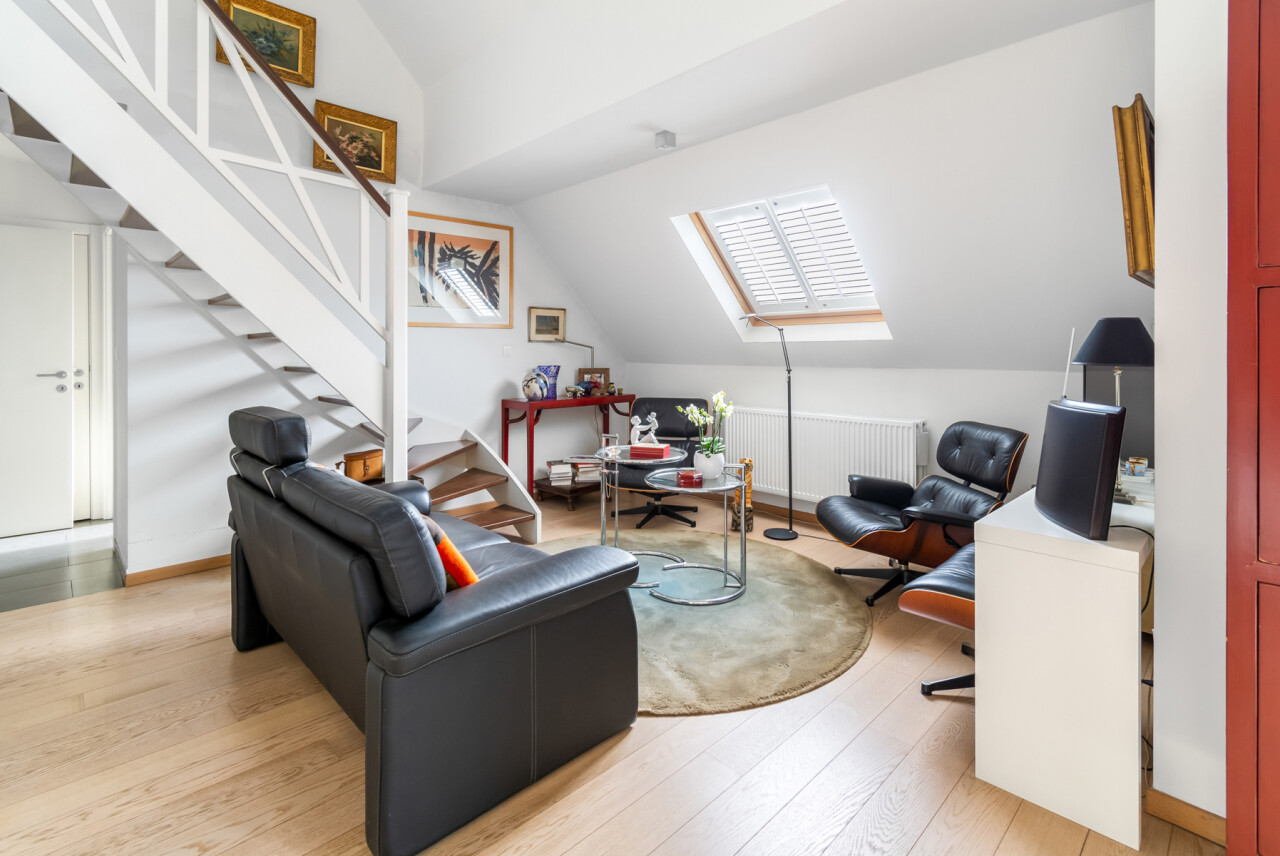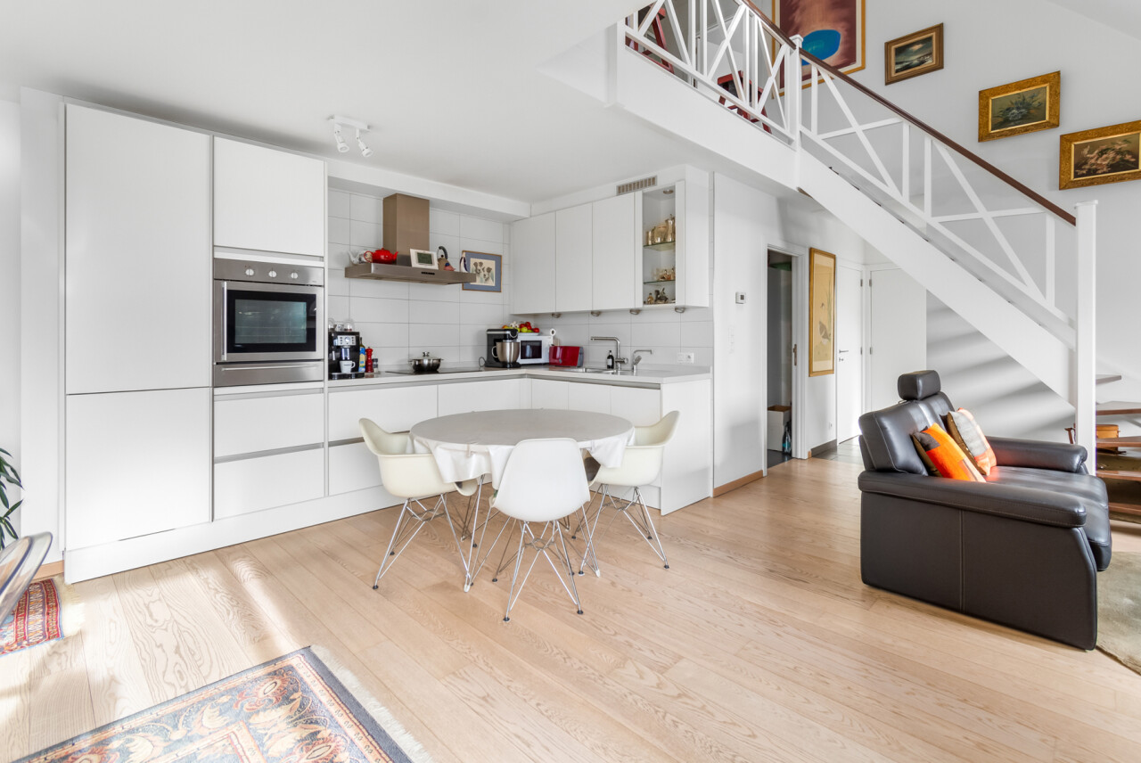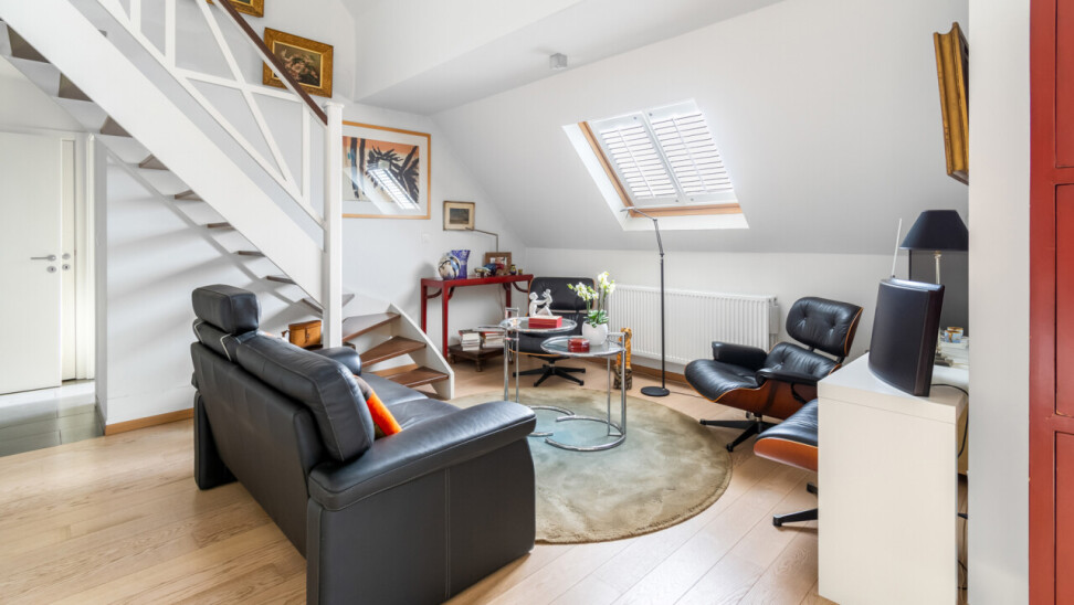 Un escalier mène à l’étage supérieur du duplex, où se trouvent deux grandes chambres supplémentaires et un deuxième WC séparé.
