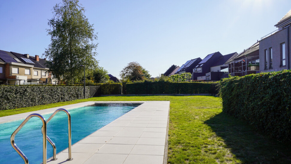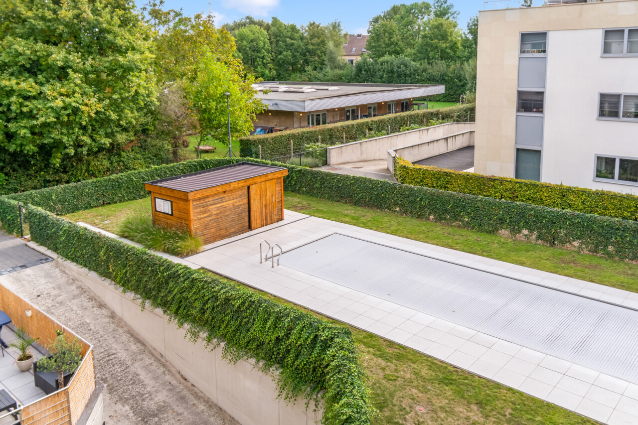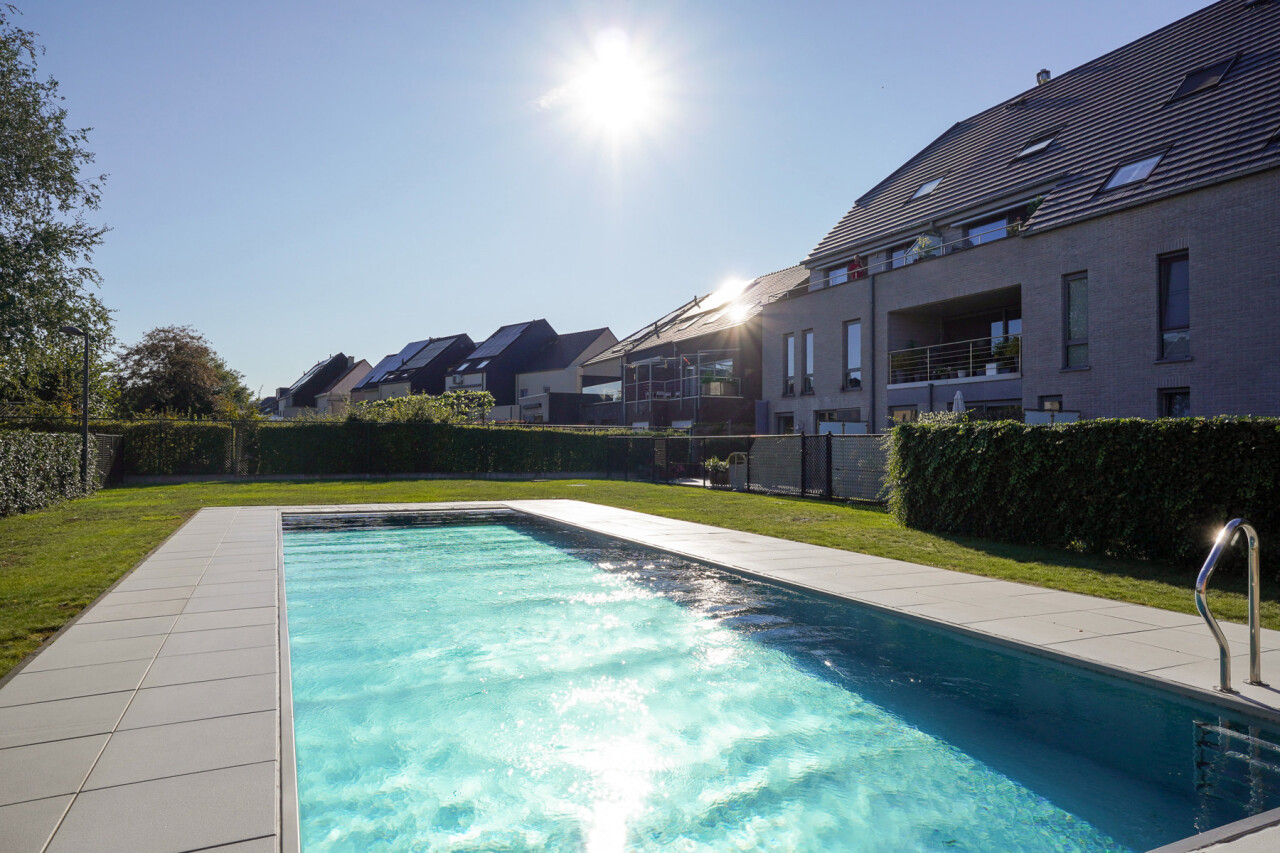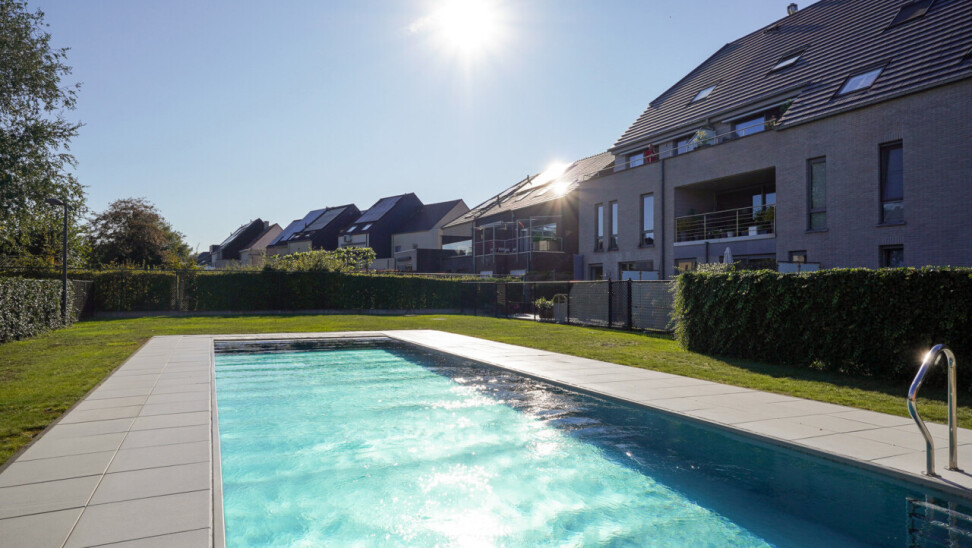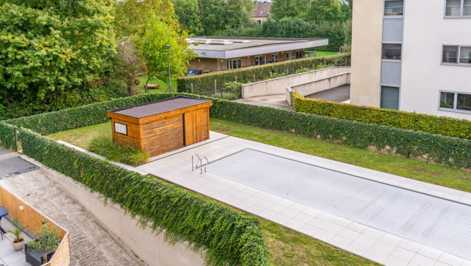 Depuis le séjour, vous avez un accès direct à la terrasse orientée plein sud, où vous pourrez profiter d’une vue splendide sur la piscine commune. Celle-ci est ouverte d’avril à septembre et chauffée à environ 28°C.