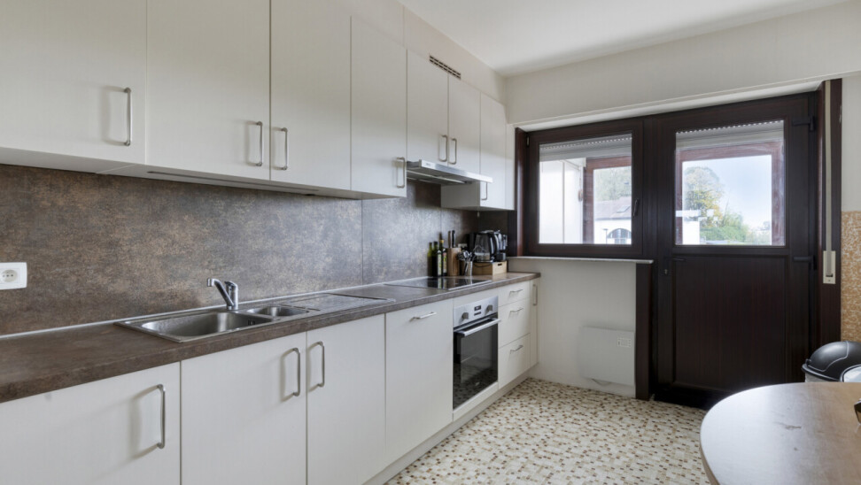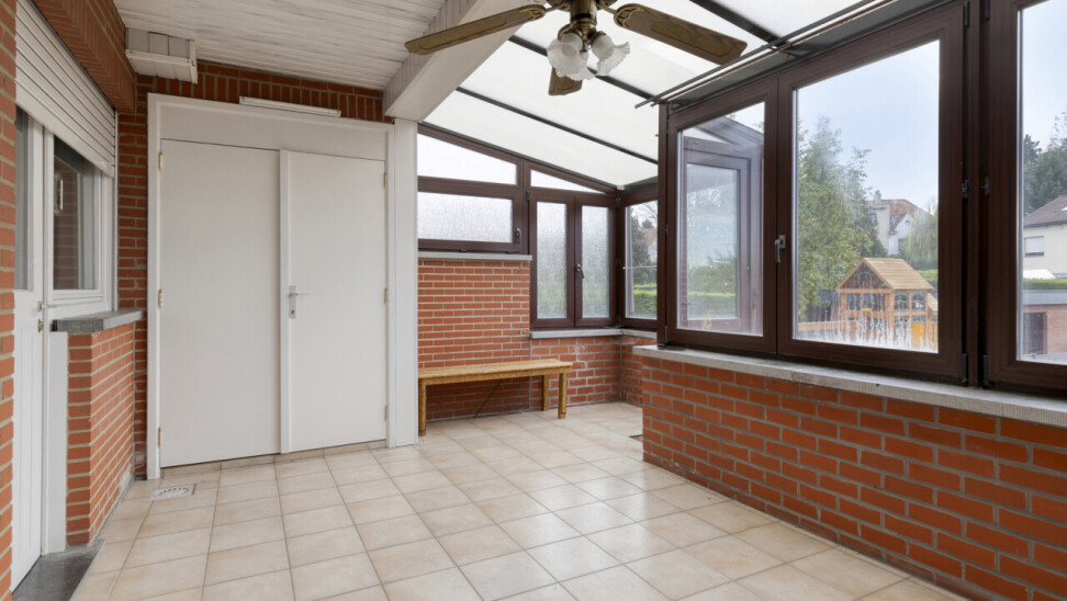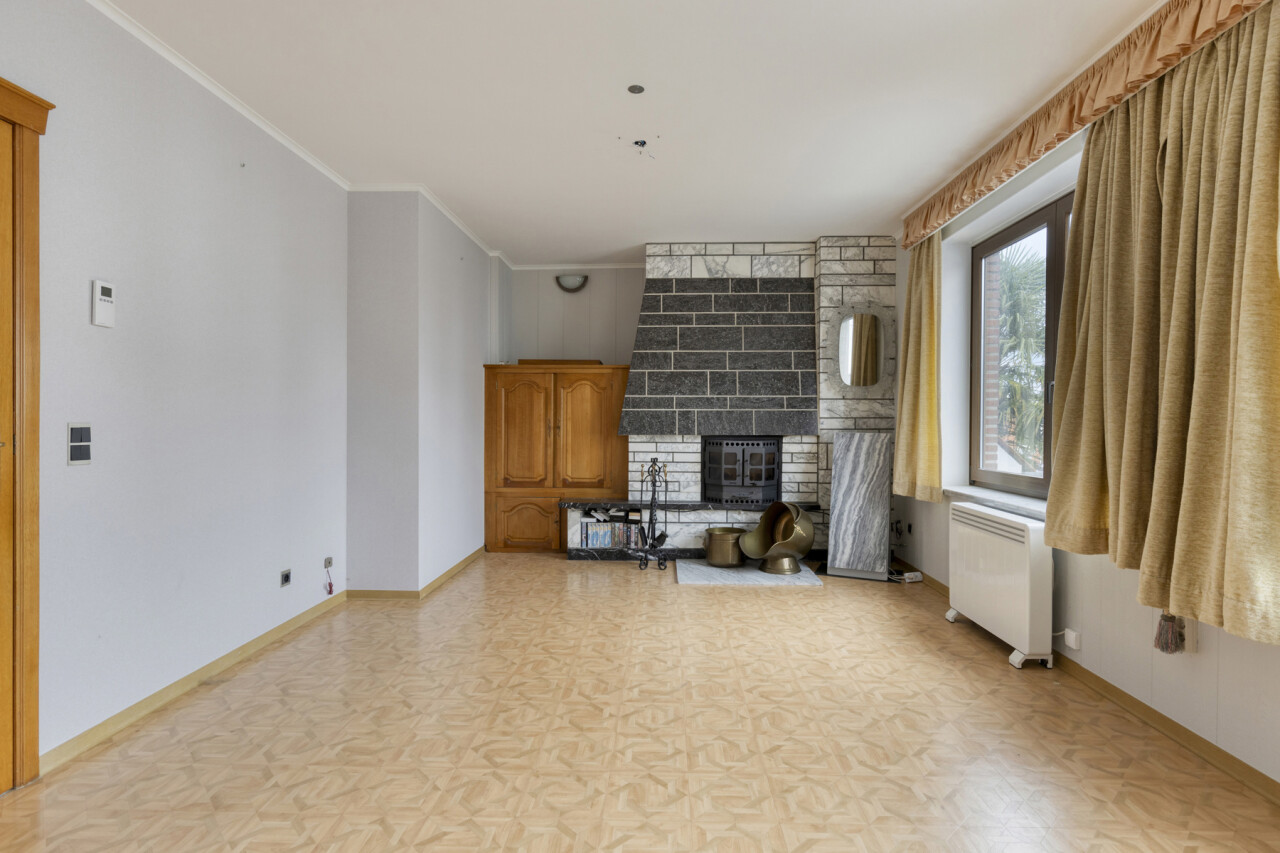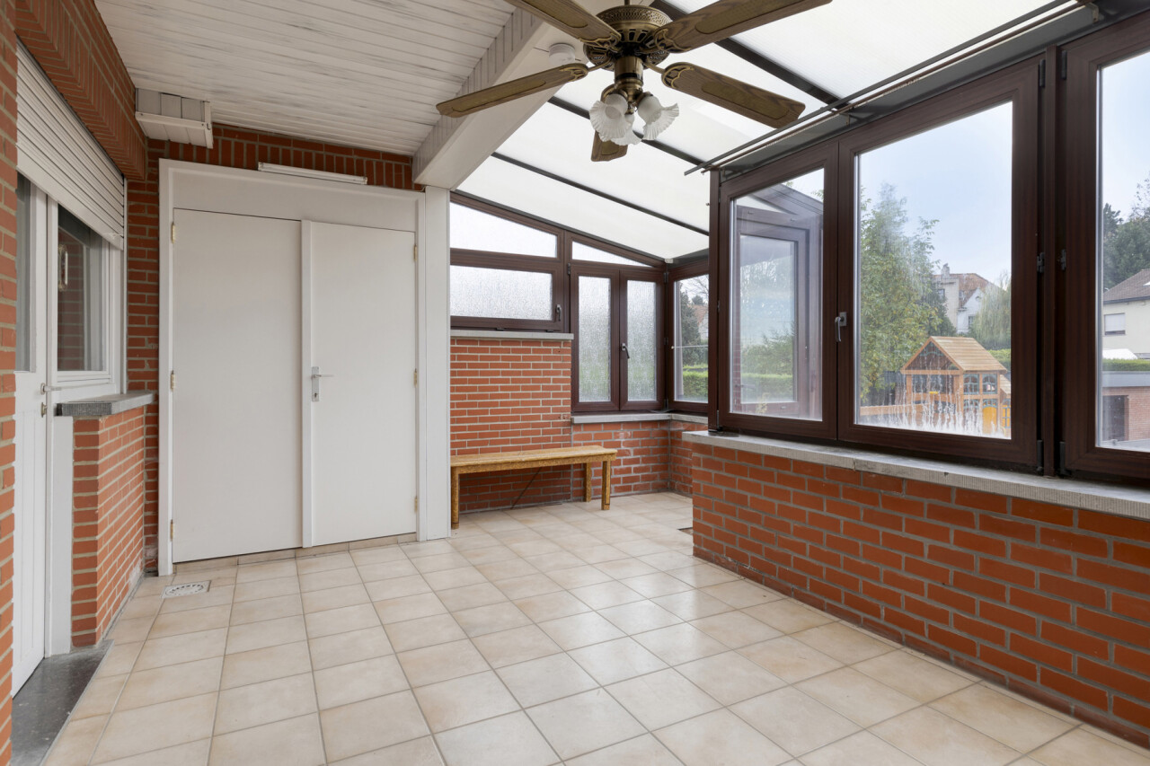 Op de eerste verdieping bevindt zich een ruim appartement van 111 m². Bij het betreden via de inkomhal vinden we links de lichtrijke woonkamer. Rechtdoor leidt de inkom naar de keuken, die rechtstreeks toegang biedt tot de veranda en de tuin. Verder beschikt dit appartement over een badkamer, een apart toilet en twee slaapkamers, waarvan de tweede bereikbaar is via de eerste.