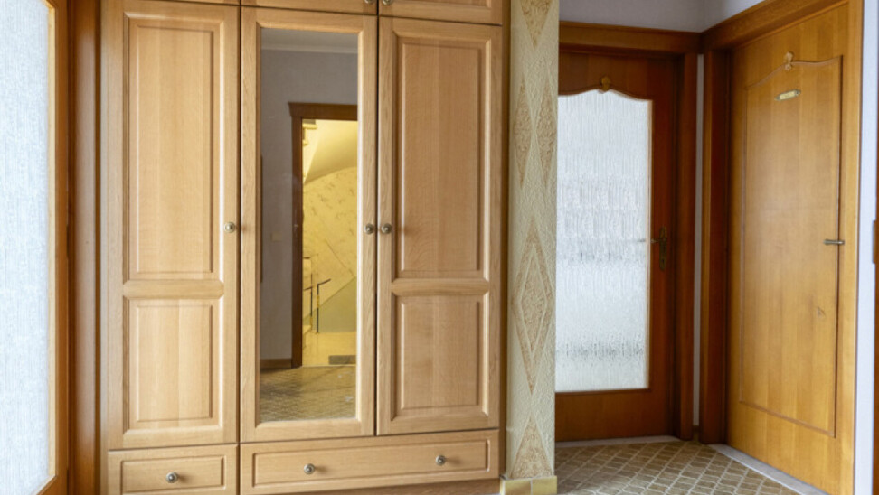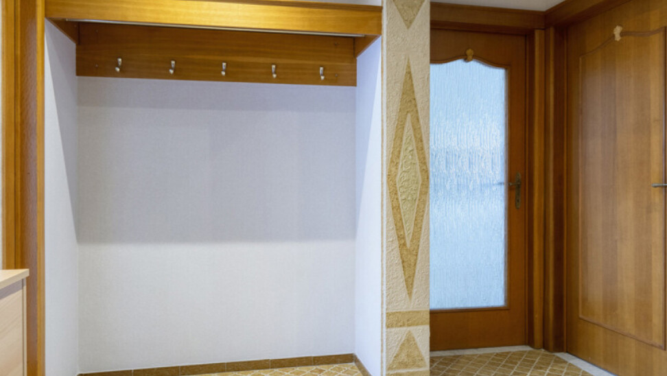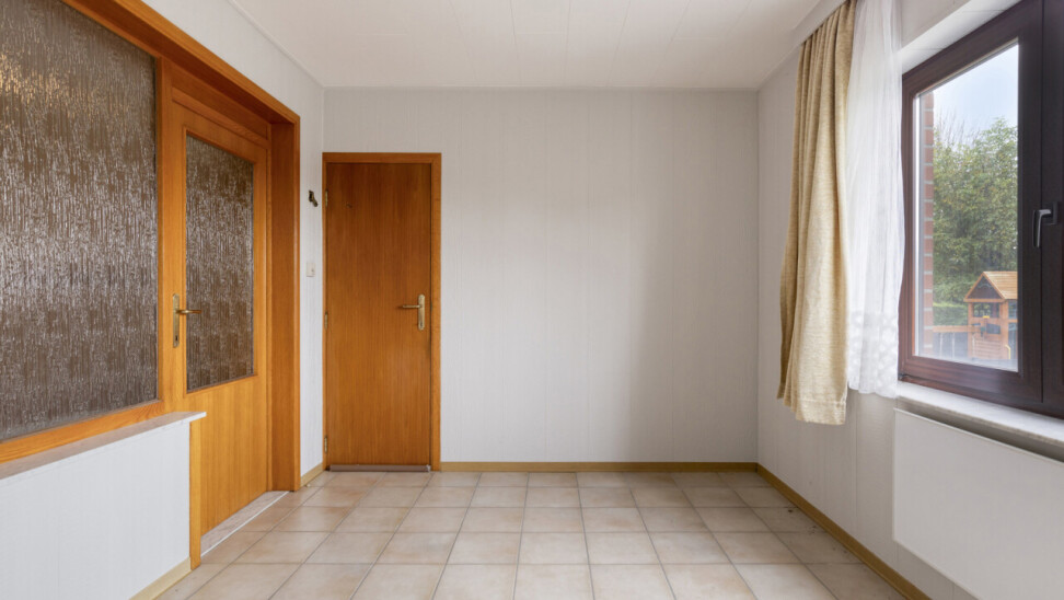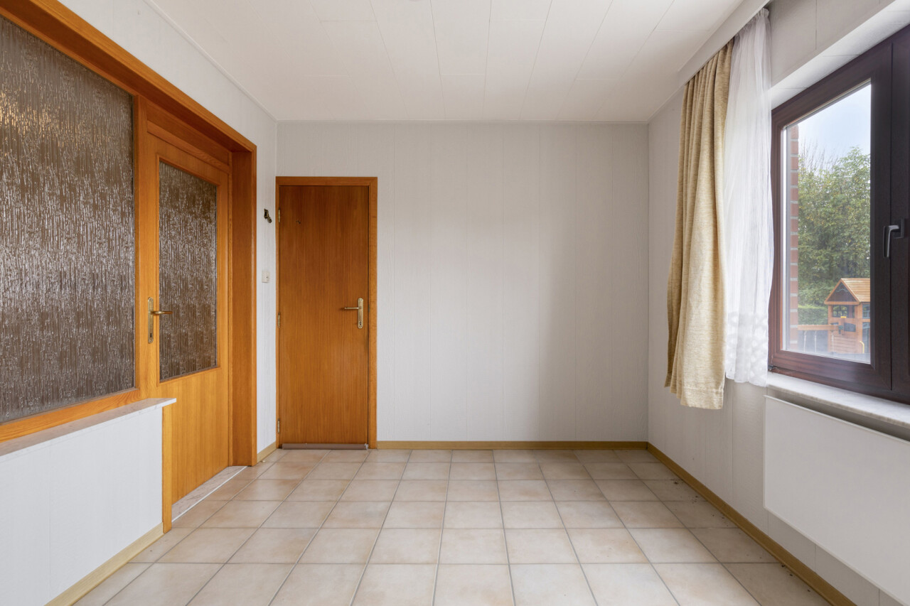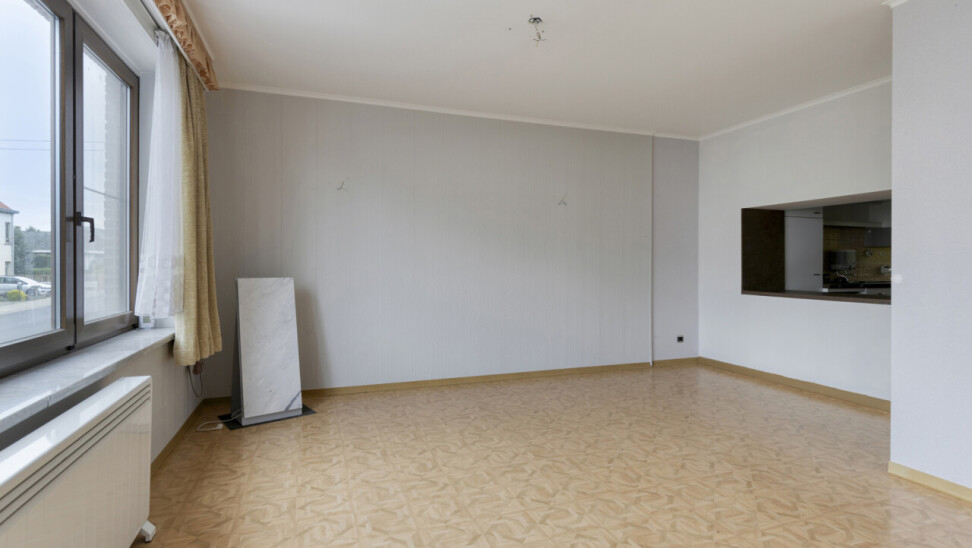 Op de eerste verdieping bevindt zich een ruim appartement van 111 m². Bij het betreden via de inkomhal vinden we links de lichtrijke woonkamer. Rechtdoor leidt de inkom naar de keuken, die rechtstreeks toegang biedt tot de veranda en de tuin. Verder beschikt dit appartement over een badkamer, een apart toilet en twee slaapkamers, waarvan de tweede bereikbaar is via de eerste.