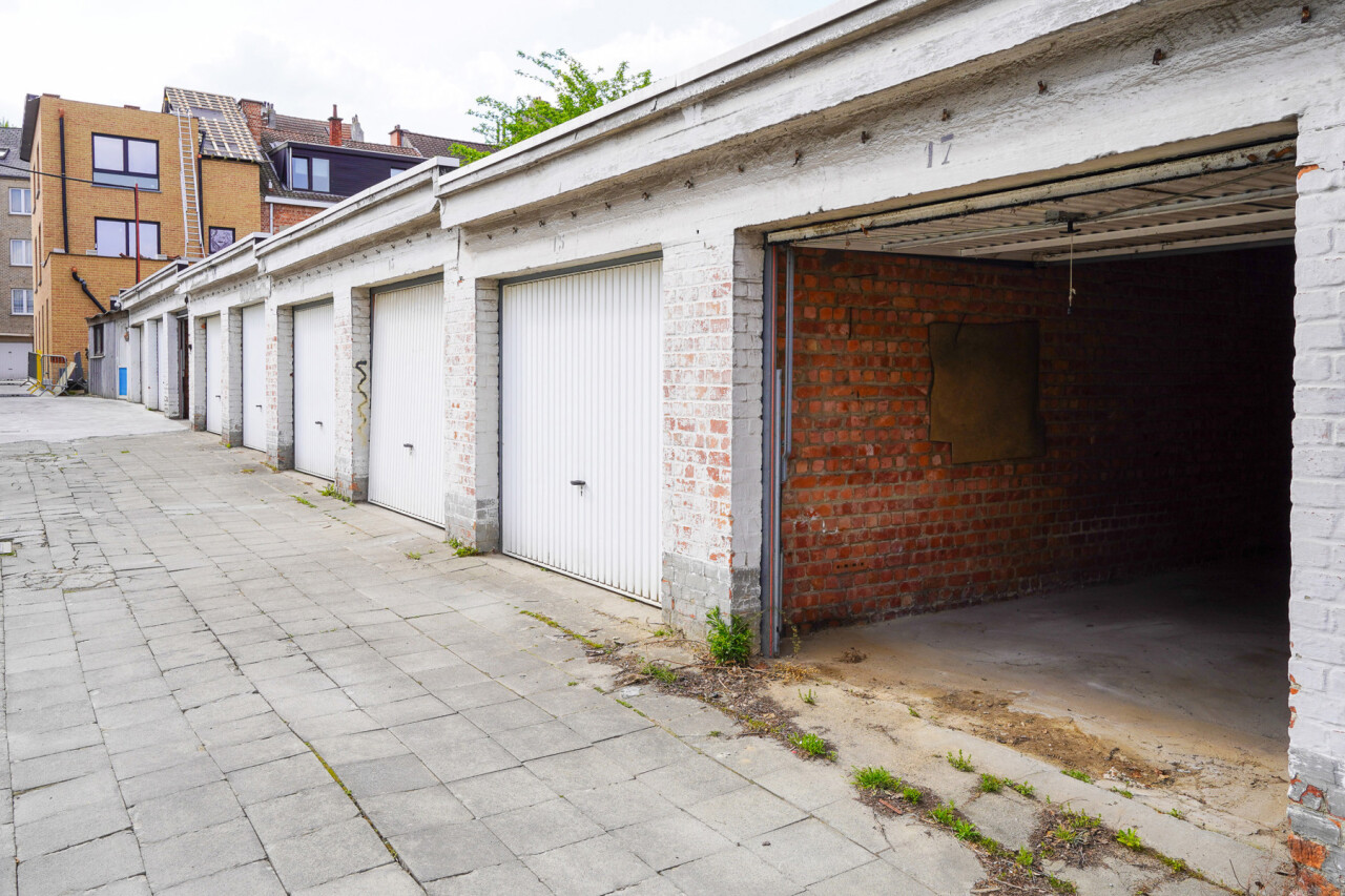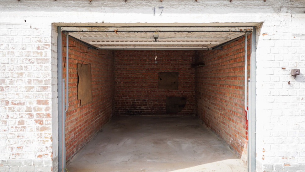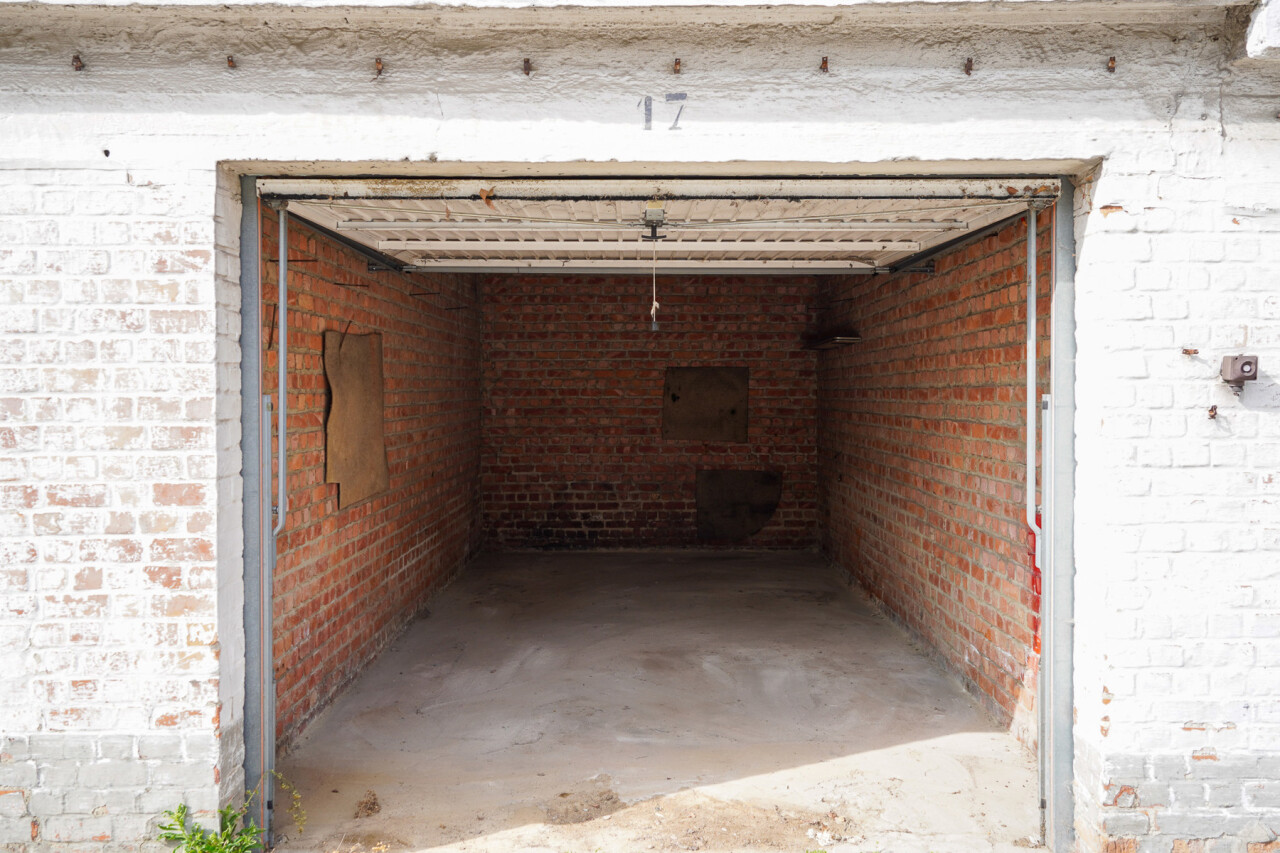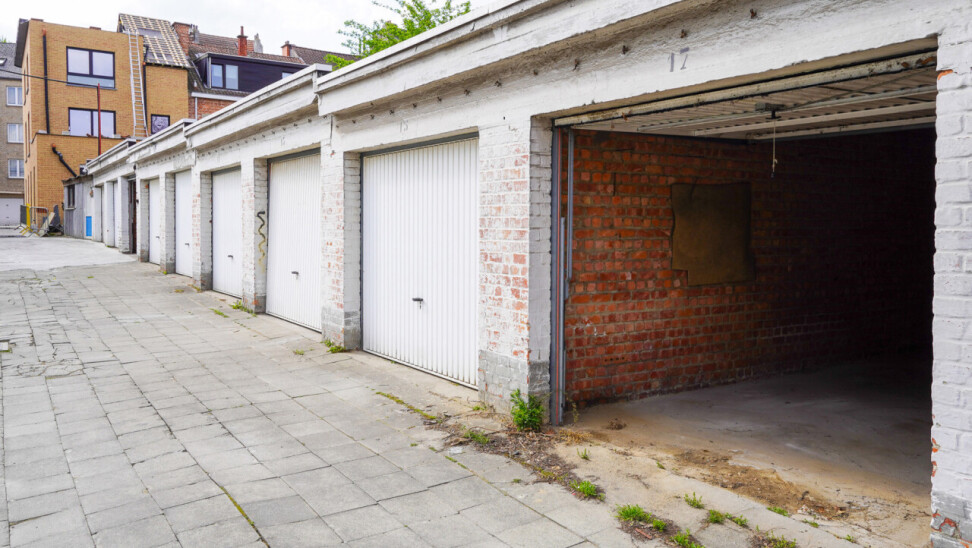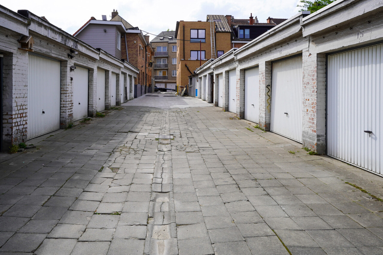 De garagebox is bereikbaar via een inrit tussen twee gevels en biedt een veilige parkeer- of opslagmogelijkheid.