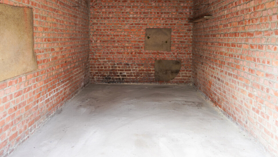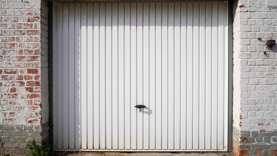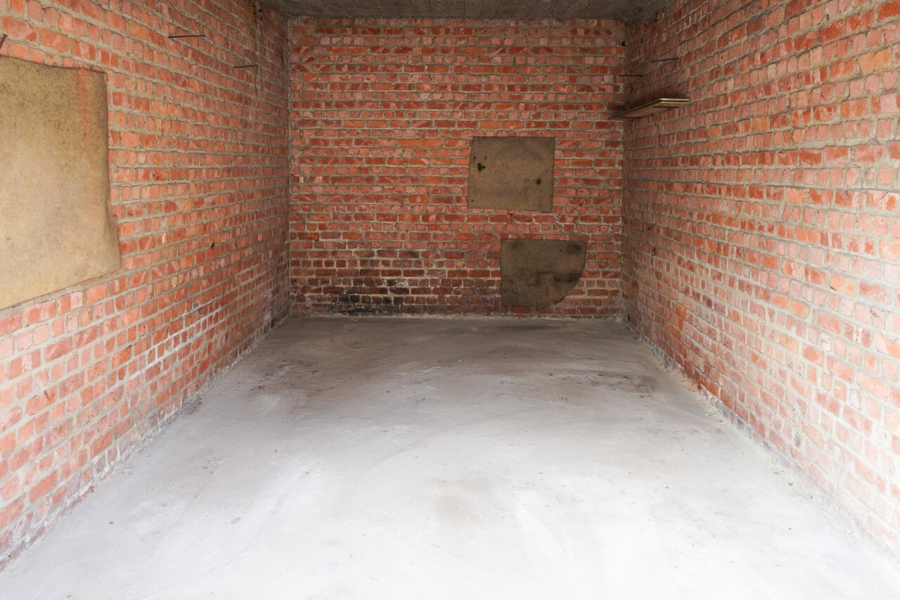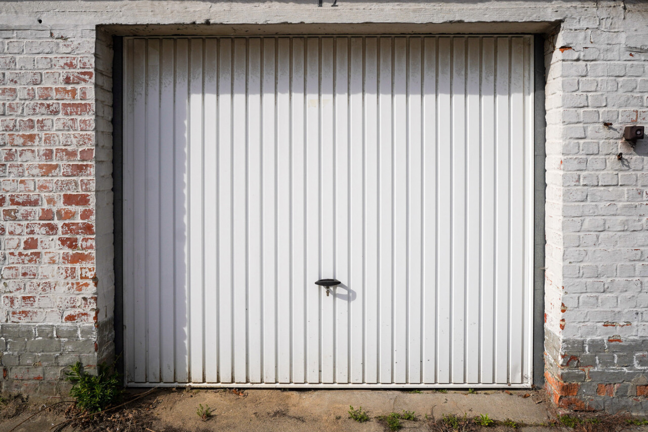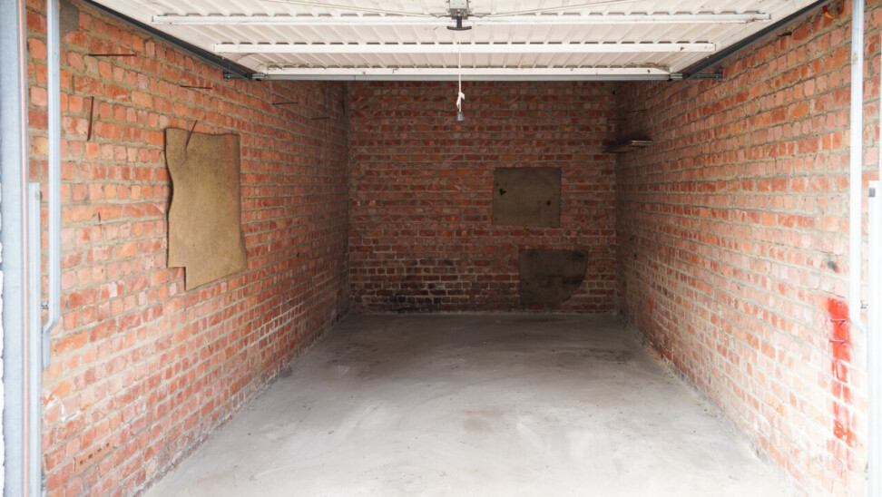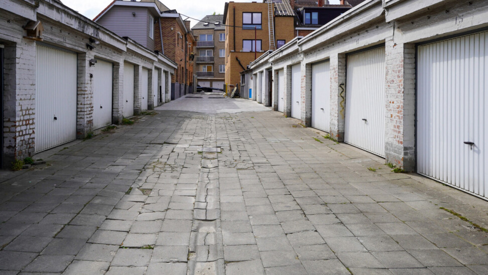 De garagebox is bereikbaar via een inrit tussen twee gevels en biedt een veilige parkeer- of opslagmogelijkheid.