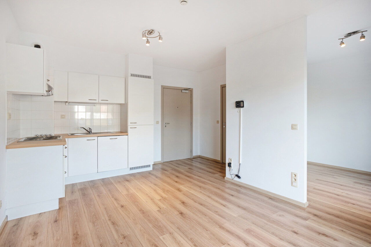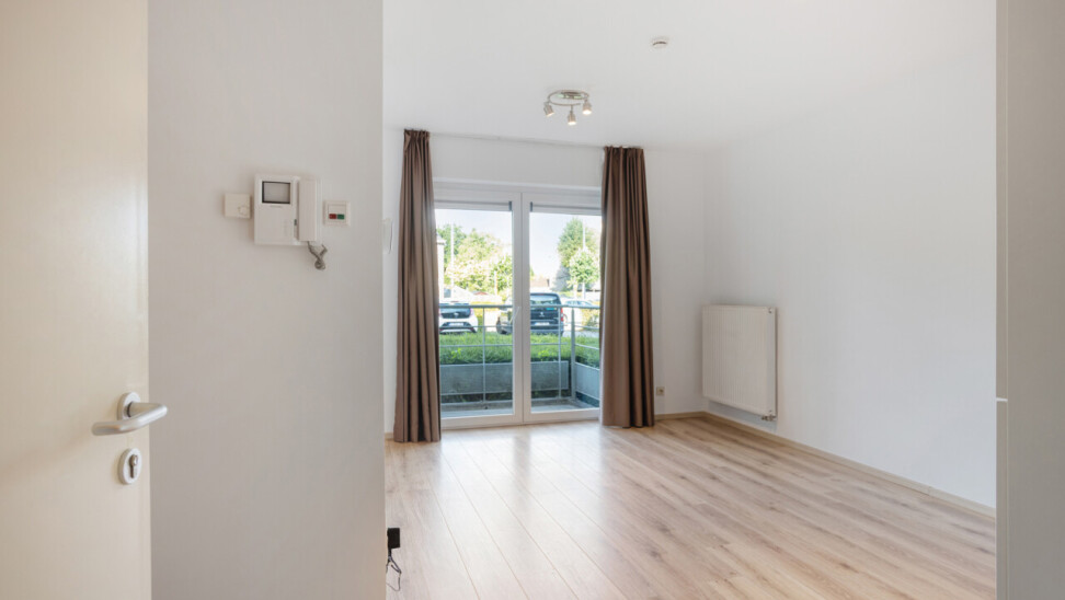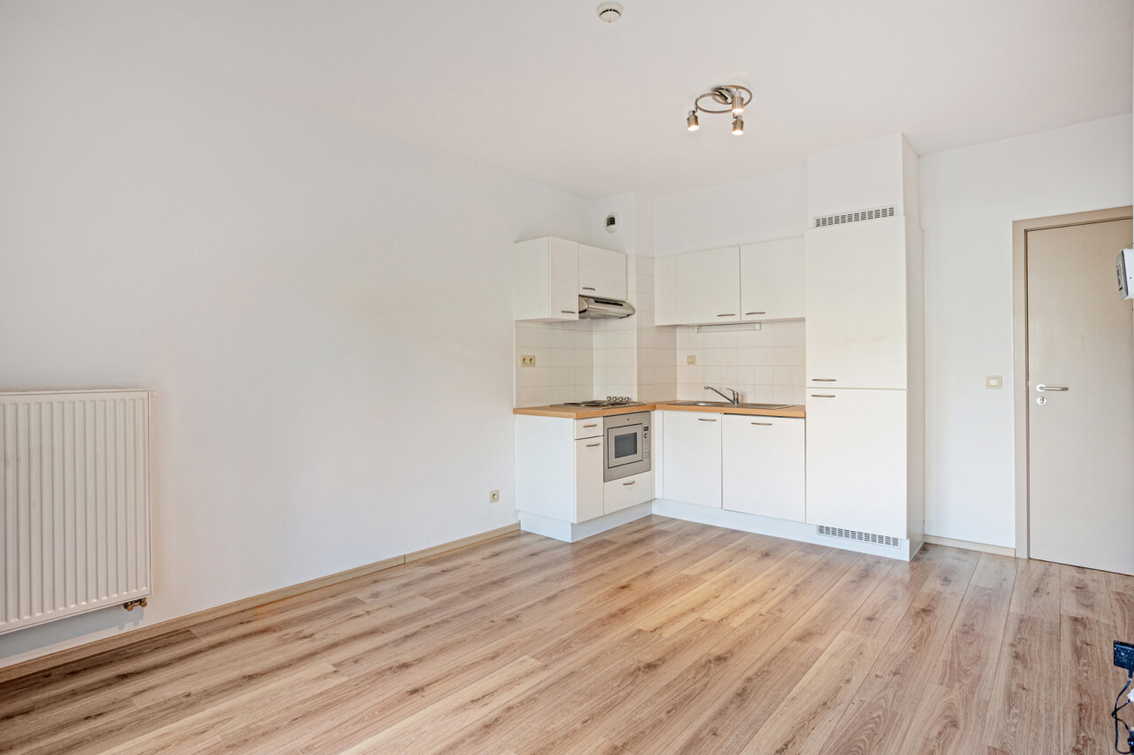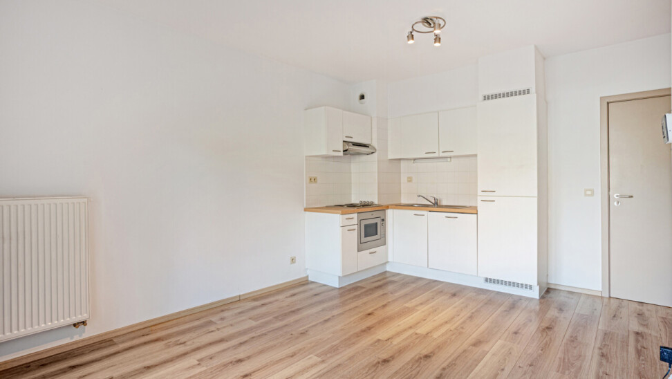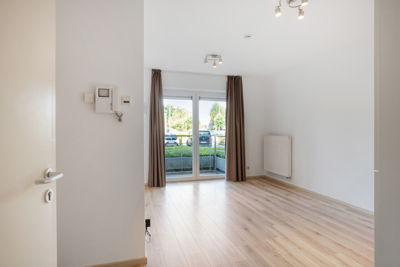 Deze comfortabele flat op de gelijkvloerse verdieping bestaat uit een inkomhal, een gezellige leefruimte met open kitchenette, een aangepaste badkamer met inloopdouche en één slaapkamer.
