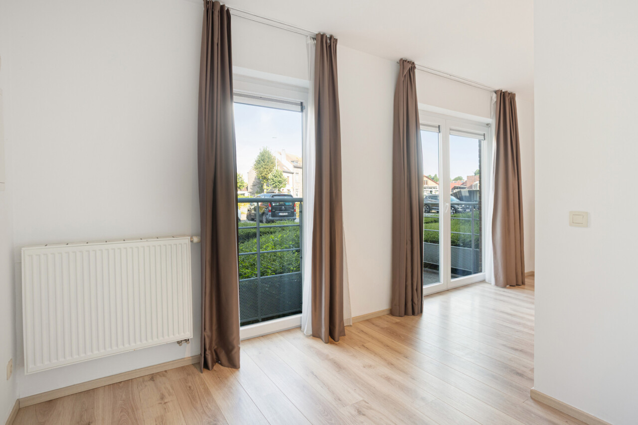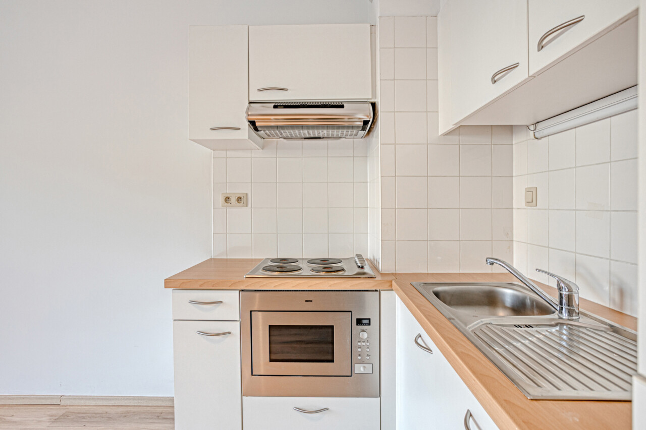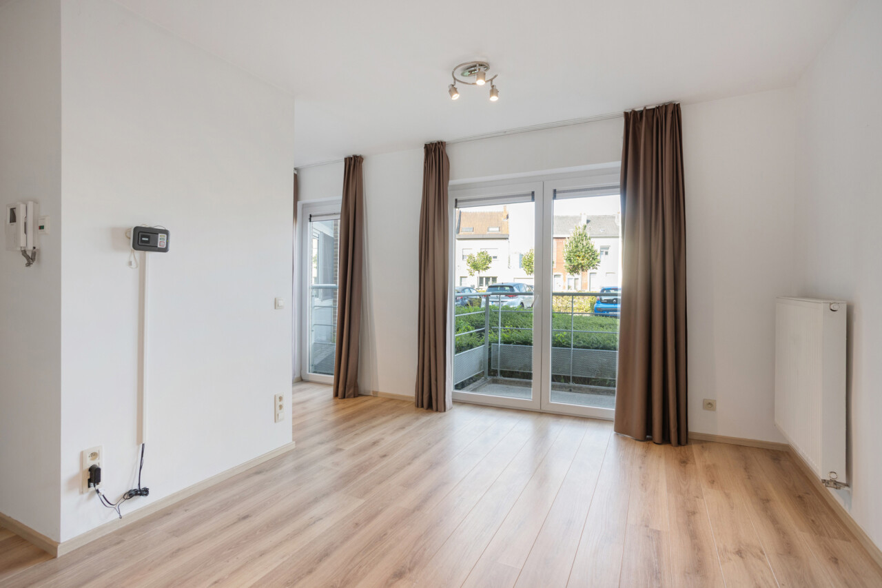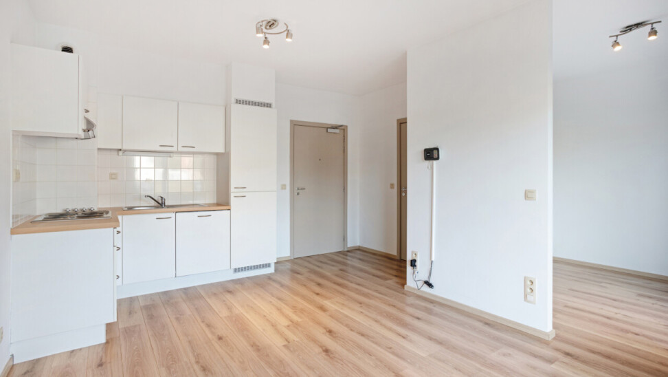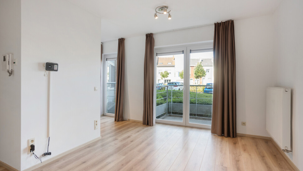 Deze comfortabele flat op de gelijkvloerse verdieping bestaat uit een inkomhal, een gezellige leefruimte met open kitchenette, een aangepaste badkamer met inloopdouche en één slaapkamer.